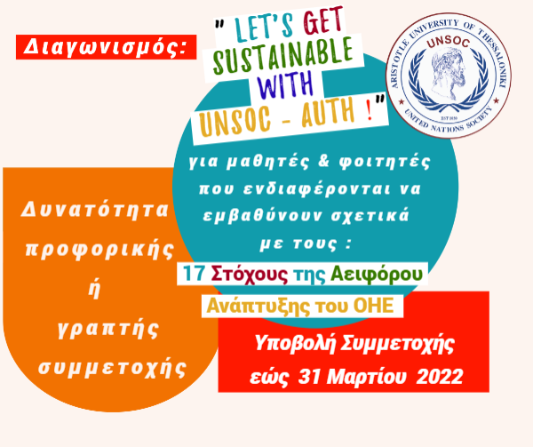 Το United Nations Society του Αριστοτελείου Πανεπιστημίου Θεσσαλονίκης στο πλαίσιο προώθησης και ευαισθητοποίησης των νέων σχετικά με τους 17 Στόχους της Αειφόρου Ανάπτυξης του ΟΗΕ το μήνα Μάρτιο, διοργανώνει τον Διαγωνισμό “Let’s get Sustainable with UNSOC-AUTH!”. Ο διαγωνισμός απευθύνεται σε όλους τους μαθητές Λυκείου και φοιτητές που επιθυμούν να παρουσιάσουν τη δική τους οπτική σχετικά με τους τρόπους που η νεολαία μπορεί πρακτικά να δραστηριοποιηθεί στην εφαρμογή των Στόχων, με απώτερο σκοπό την επίτευξή τους μέχρι το 2030.ΠΡΟΣΚΛΗΣΗ-ΔΙΑΓΩΝΙΣΜΟΥ-UNSOC-AUTH-1ΑΦΙΣΑ-ΔΙΑΓΩΝΙΣΜΟΥ-3